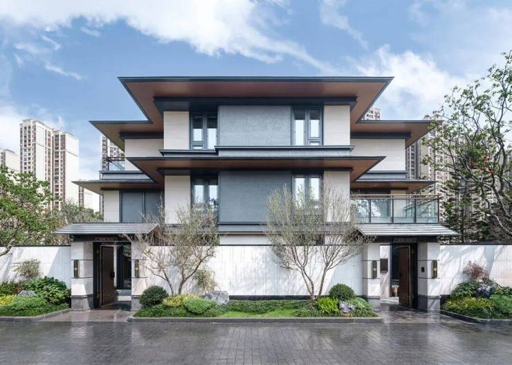 项目以宋代生活为研究模板,结合金地的“科学筑家”理念,通过屋檐、平座、挂落、寻杖等传统中式建筑元素的现代演绎,在功能性与美学感知的平衡上进行精细化的节点设计。“以材为祖”打造全新的现代宋风符号;精工匠造,还原宋代建筑神韵;屋脊设计使用现代材料呈现纤细感、水平感;寻杖在转角望柱搭交而伸出,打造定制化极简的双层绞角造;整体色彩借鉴了宋画里茶白、鹤灰、玄天、缃黄,雅致又有层次感。