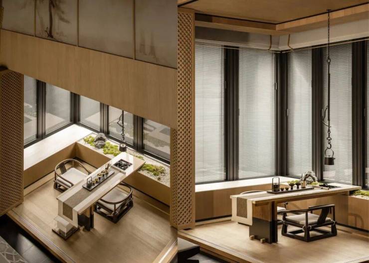 木料随时间渐生光泽,厚重纯粹,以此为茶室主材,国风雅韵油然而生;