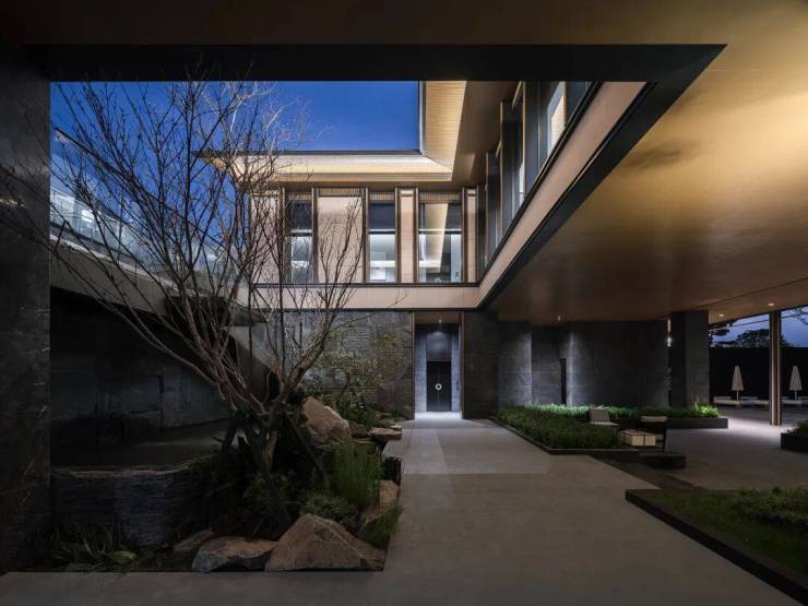 主入口为弧形环抱山门的形式,门楼挑高超4.2m,结合外界面围墙一体化设计,顶部浅金色铝板,花岗岩石材外墙和金属外墙结合,打造具有宋韵雅奢的山门坡屋顶门楼,结合跌瀑水景与点缀景石,营造了归家的礼序感和尊贵感。