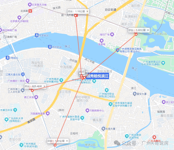 地铁:地块其实不近地铁站,最近2号线市二宫站距离约1.2公里,需要接驳,公共交通出行有壁。1站江南西/海珠广场,2站公园前/江南西;东侧10号线滨江东站在建中,未来可实现1站东湖,2站五羊邨,3站广州大道中。