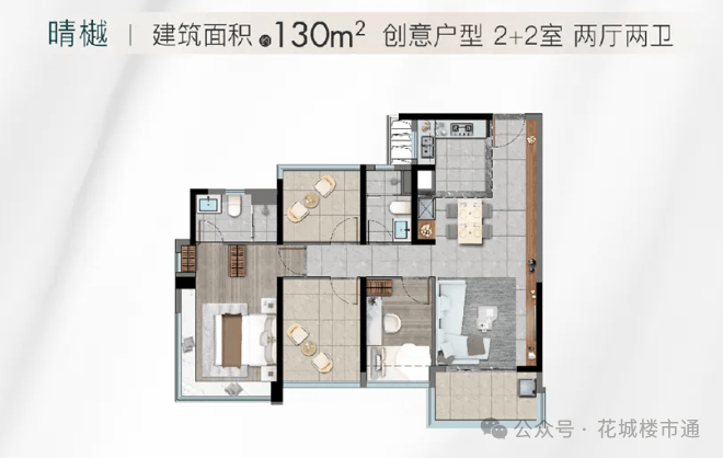 130㎡四房:五开间朝南,6.5米阔景阳台,主卧套房配置奢华。