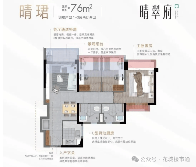 项目主推建面约76-130㎡三至四房,全南向设计,得房率超90%: