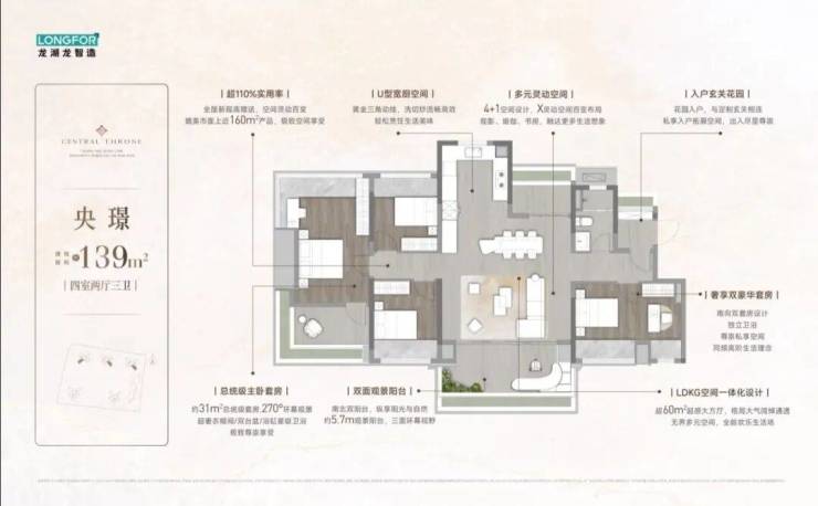 高使用率户型:采用“0飘窗”设计,通过优化空间布局,实现超110%的实用率,如95㎡户型实际使用面积可达120㎡左右,139㎡户型赠送面积近37㎡,居住体验媲美市面更大面积房源。