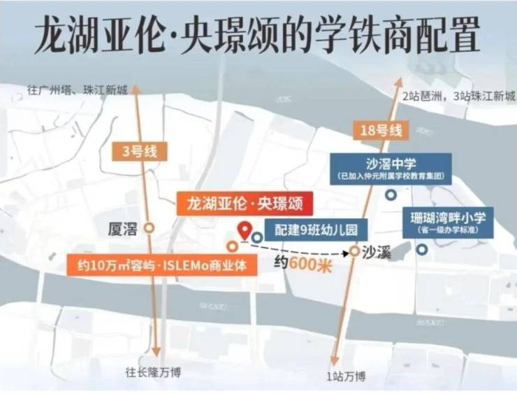 交通便利:临近地铁18号线沙溪站(约600-700米),1站可达万博,2站至琶洲,3站到珠江新城;距离3号线厦滘站约1公里,自驾可通过新光快速、华南快速等主干道,15分钟内抵达珠江新城、琶洲等区域。