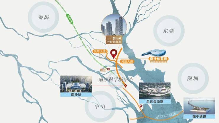 项目位于凤凰大道/凤亭大道上,可接驳南沙枢纽站、深中通道等核心交通主脉络,畅达大湾区。