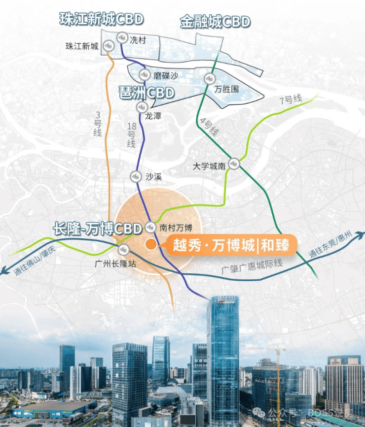 地铁线路交汇:周边有地铁 3 号线、7 号线、18 号线等多条轨道交通线路交汇,如从项目步行至南村万博站约 1.2-1.3 公里 ,可便捷到达琶洲、珠江新城等地