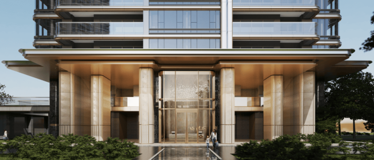主入口是约55米宽、约8.7米挑高的酒店式大门,再以各种奢石铺陈;