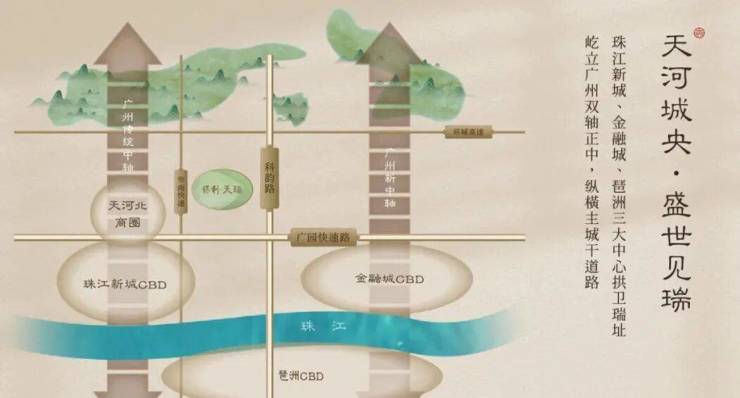 项目位于天河五山汇景新城板块内,珠江新城和琶洲金融城两中轴间的核心位置,楼盘身后就是汇景20年醇熟的圈层配套