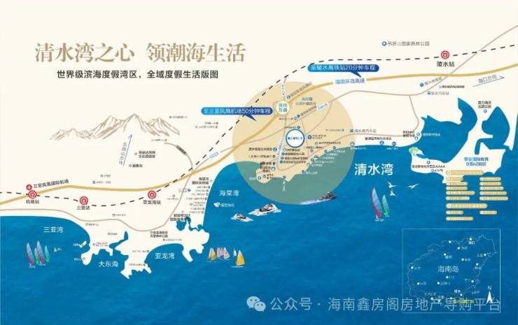 项目地处北纬18°以南,距三亚市区直线距离约45公里,尊踞大三亚醇熟生活圈;位于清水湾度假区中央核心,坐拥清水湾万亩文旅醇熟配套,紧邻陵水黎安国际教育创新试验区,致力于打造清水湾片区产品标杆。