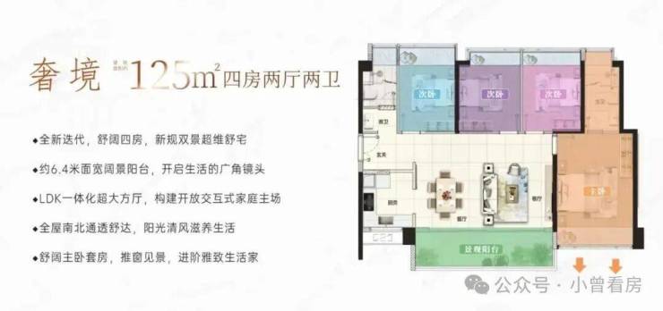 110㎡四房两厅两卫剩余少量现房房源,主要在 1-2 栋的 3-4 楼及高楼层,LDK 一体化设计,客餐厨阳台连通,南向面宽达 10.2 米,次卧面积均在 9㎡以上,适合三口之家。