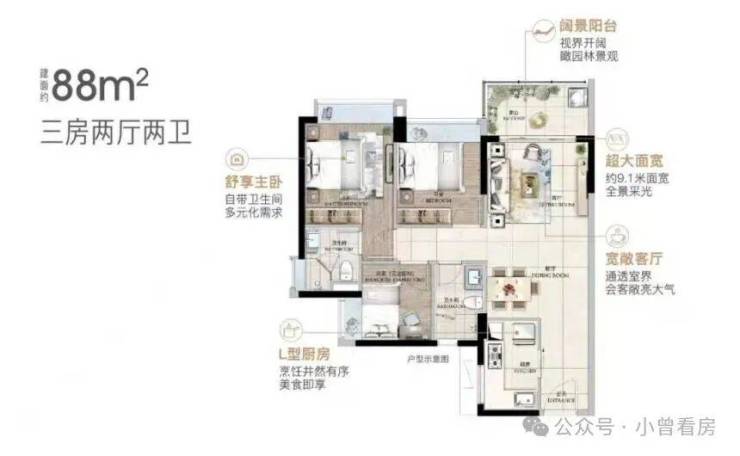 88㎡三房两厅两卫是刚需主力户型,集中在 1-3 栋现房的 5-30 层,户型南北通透,客厅连接 3.6 米宽阳台,主卧带飘窗台,收纳空间充足,适合新婚夫妻或首置家庭。