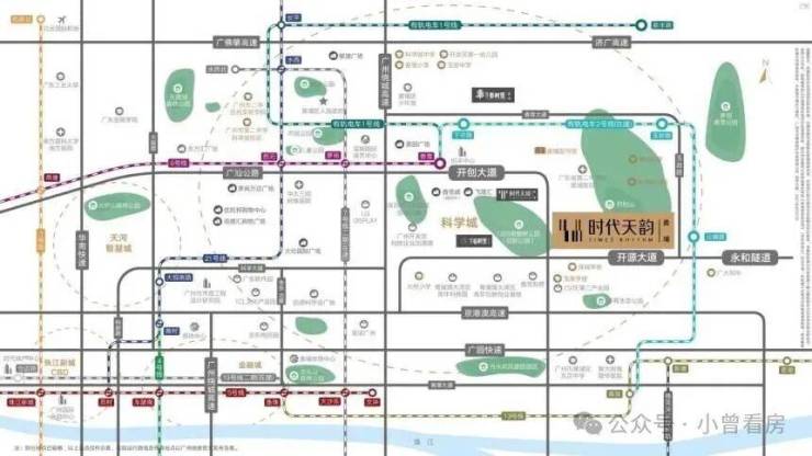 黄埔科学城作为广州向东发展的核心板块,随着地铁 7 号线二期的全线贯通,周边住宅项目的通勤优势进一步凸显,时代天韵(黄埔)便坐落于此,具体位置在开源大道北侧、玉岩路西侧,是板块内当前在售的成熟大盘之一。