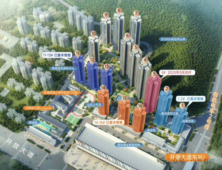社区内部打造了约 5 万平方米艺术园林,设有大型泳池、300 米健身步道、儿童乐园和邻里会客厅,架空层还规划了社区少年宫、星光老年之家,不同年龄段居民都能找到合适的休闲空间。不过低楼层户型的山景视野会被树木略微遮挡,部分临开源大道的楼栋可能会受到车辆噪音影响。
