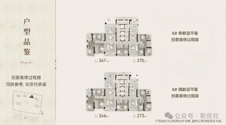 270/273㎡户型特点: 一层两户,3T2户独立梯厅互不扰; ·5.7*11.65m直厅宽敞大气; ·客厅、阳台、众数套房可正南望江及 琶洲会展; ·南北对流双阳台; ·工人梯独立动线,保障豪宅私密性; ·主卧270°景观转角飘窗; ·800mm飘窗可打; ·奇数层32㎡6.6m通高平台空间;