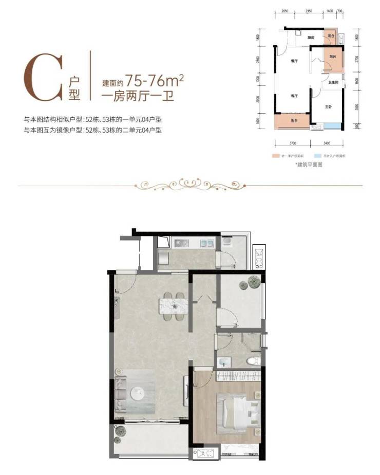 约75-76㎡ 1房2厅1卫 |纯南向全明户型,小户型大空间,约3.7m观景阳台,一揽风情园林,客餐厅一体布局,延展生活尺度,南向大尺度主卧,阳光美景相伴