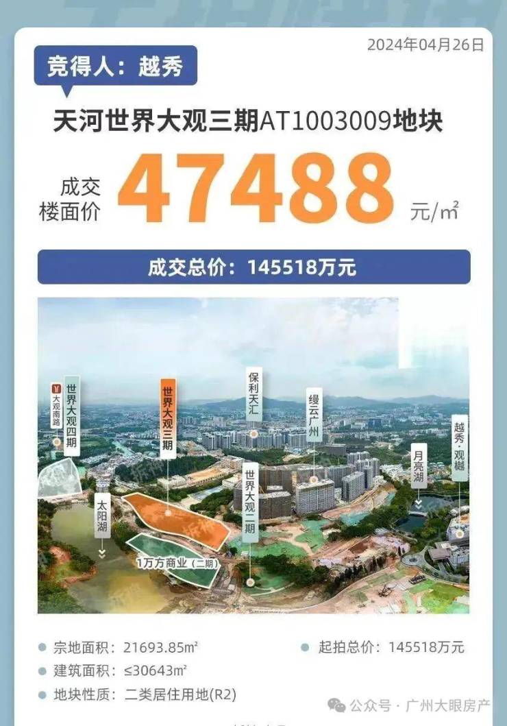 2024年4月,越秀梅开三度,拿下天河世界大观三期地块,折合楼面价47488元/㎡