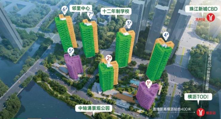 小区配套:提取漂浮岛屿的灵感元素,将外部花园街区及内部立体多维景观相结合,打造纯林自然的轻奢度假感园林景观,地块临近广澳高速、南沙港快速路,距离现状地铁 18 号线横沥站 350 米,旁边是规划中的 54 万㎡横沥 TOD 综合体。