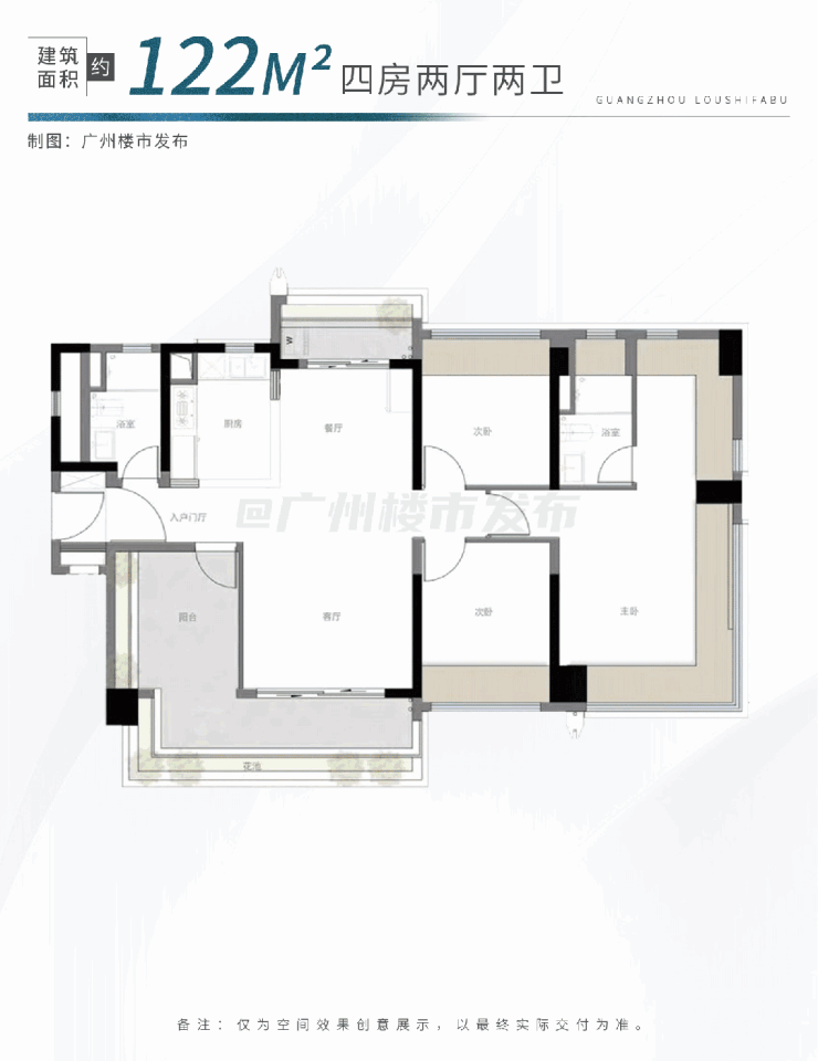 建面约 120 平的四房两厅两卫是公区 LDBK 一体化设计,主卧带超大转角飘窗,三面采光;