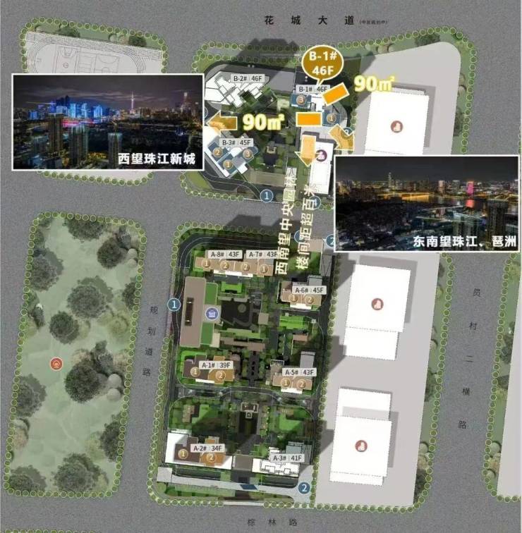 项目正南侧为宽阔珠江面和琶洲CBD,西侧尽揽珠江新城繁华烟火,东侧瞰金融城天际线。内部精致园境则纵横分布,将每个楼栋簇拥包围。