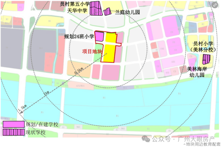 地块1.5公里范围内有员村第五小学、天华中学、兰庭幼儿园、员村小学(美林分校)、美林海岸幼儿园等。