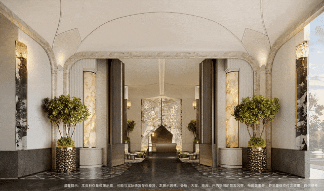 走进会所大堂,奢白主调搭配流畅流线的艺术拱形门廊,辅以纹理云石镶边,典雅质感扑面而来。