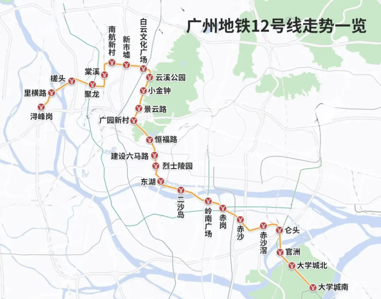 12号线(已通车)-广州换乘之王,广州市第一条无人驾驶地铁线路,与十数条轨道线无缝换乘,共经过白云文化广场、烈士陵园、二沙岛、赤沙等17个换乘站,可直达大学城,连通白云、越秀、海珠、番禺四大区域。