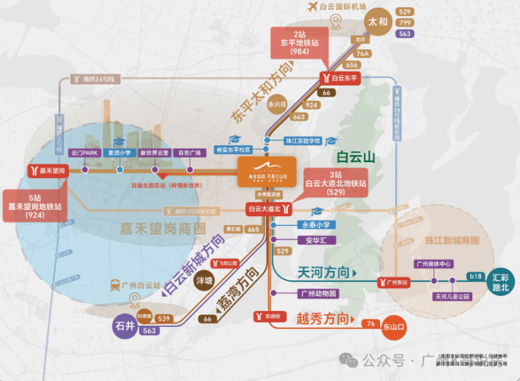 【地铁】地铁2号线、3号线、14号线,半小时通达广州主城中心生活圈;还预留公交站场与佛山地铁6号线地下衔接通道,未来将实现集公交、地铁一体化换乘。