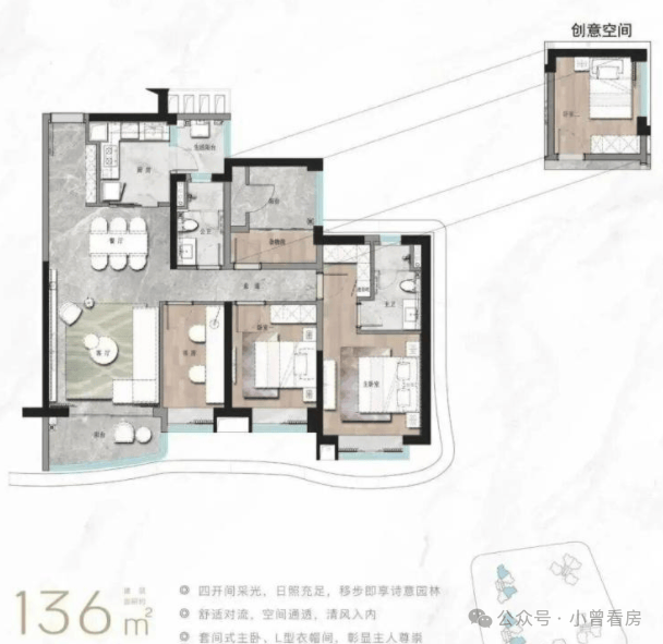 136㎡四房户型空间宽敞,建议优先选择东户,能兼顾景观与日照,动静分区明确,部分户型带有双阳台,生活与休闲空间区分清晰,适配三口或四口之家;