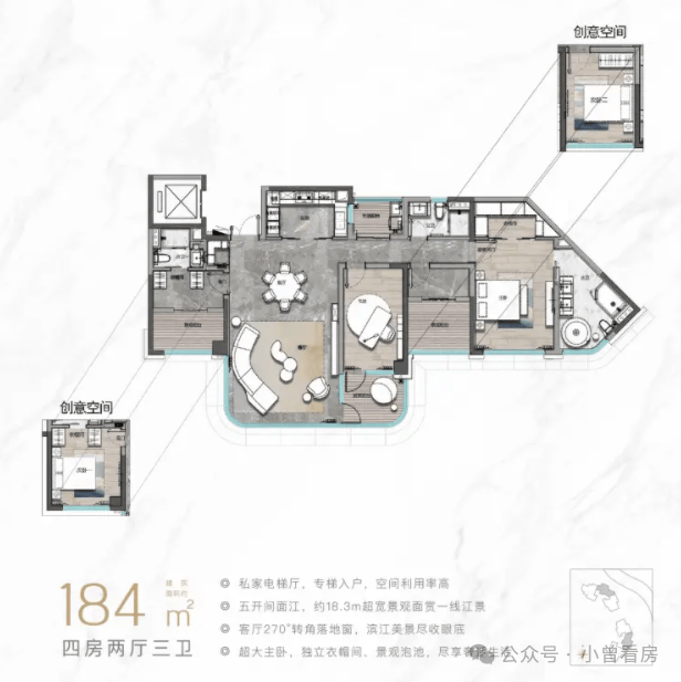 184㎡四房户型升级为嘉格纳厨电七件套,配置双景观套房,主卧带有270°环幕观景窗,江景视野开阔,还设有独立家政间,适合多孩或三代同堂家庭;