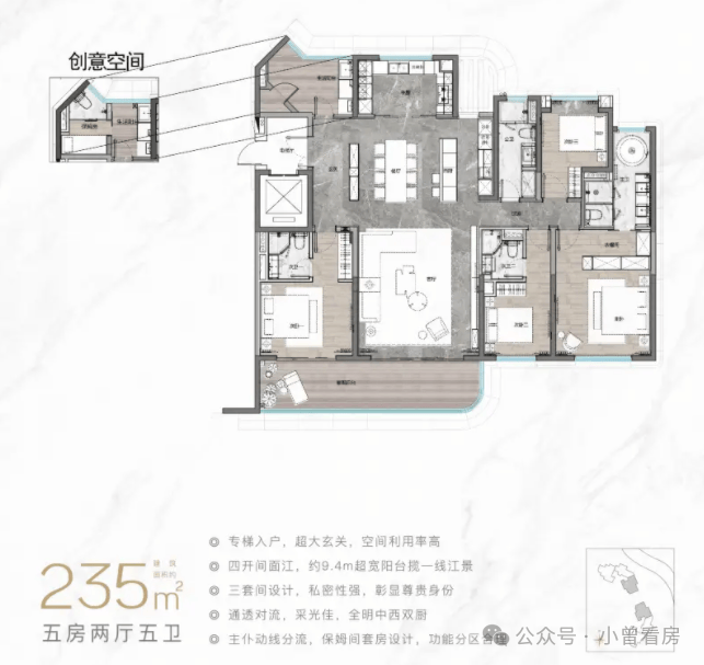 目前项目在售户型涵盖建面约128-238㎡,均为装修交付,实用率超100%,性价比突出。