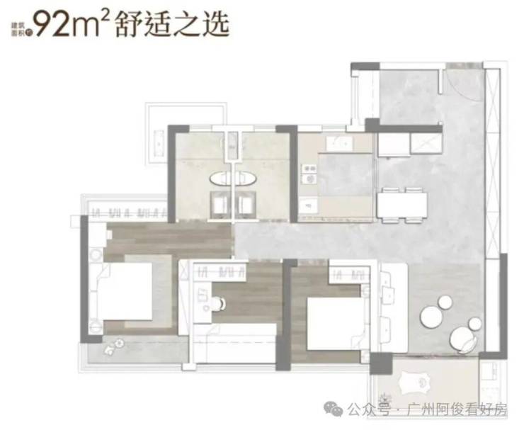90㎡三房:总价380万起(单价约4.2万/㎡),仅剩约20套。