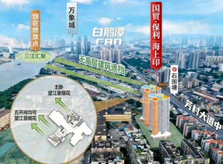 项目位于白鹅潭板块石围塘片区,离万象城只有一个地铁站距离。约220米可达11号线石围塘站、与珠江新城、琶洲、客村、体育中心等产业板块,最多只需一次换乘。