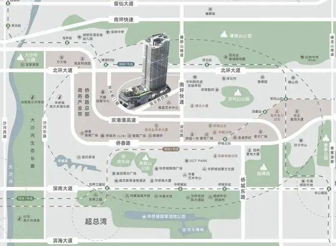 寰侨观邸位于深圳市华侨城核心区域,这一区域以其成熟的配套设施、优越的自然景观资源以及良好的生活便利性而著称。项目周边不仅有丰富的购物中心、超市、医院、学校等生活配套设施,还紧邻地铁2号线侨城北站和7号线深云站,多条公交线路贯穿,出行极为方便快捷。