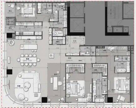 户型鉴赏• A户型:约396㎡的3+1房2厅2厨5卫,由llsd亲笔操刀设计,270°的城市景观、全套房和双主卧设计,约9.9米的超宽客餐厅开间,主卧方正且面积达24㎡,明卫设计,次卧带阳台,中西厨结合,还有灵活多变的多功能房。