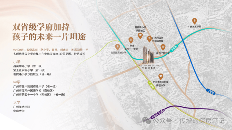 项目位于海珠区最强教育板块之一,根据海珠区教育局公布《2024年海珠区公办小学招生服务地段表》:中旅天宸府所属沙园街橡胶新村社区,约500米直距昌岗中路小学,符合就近入读条件。