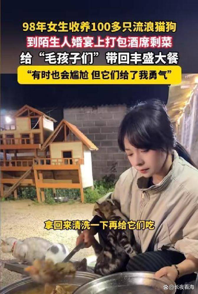 想到这个办法后,她就开始去婚宴打包剩菜了。宣宣本来有点害羞,但是为了猫咪们能吃饱,她就主动走到那些不认识的新人面前,然后说出自己的想法。通常呢,新人们都能理解她,也支持她。有的人甚至会很热情地请她坐下来一起吃。不过她都会很有礼貌地拒绝,但是她会在礼金簿上放个100块钱左右。她笑着说,这是“小猫小狗交的饭钱”。我觉得这个细节特别暖心,也体现了她对新人的尊重。