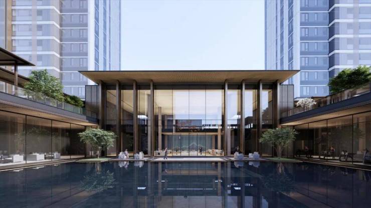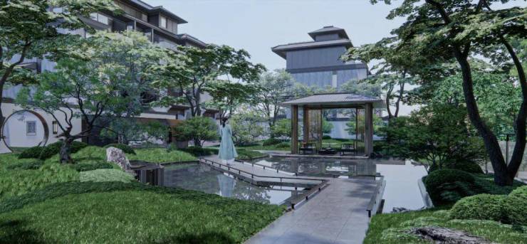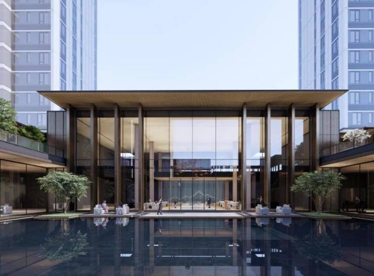 在大师团队的妙笔下,整个项目规划建设7栋塔楼、8栋板楼、15栋叠墅,高层围绕南面的黑白面将军山和南屏水库形成为围合之势,将面宽1000m的湖景和5000m的山景资源最大化,实现建筑与外部环境的融合协调。
