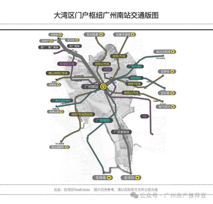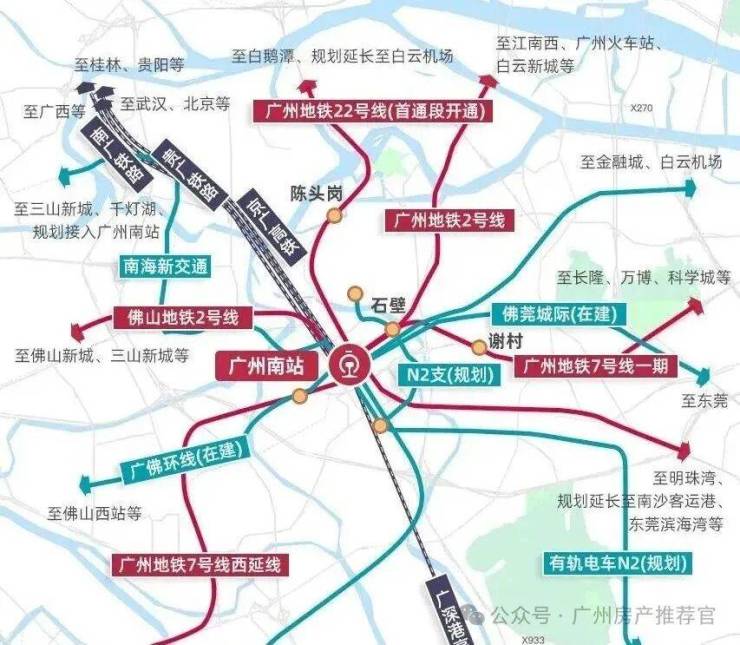 4站至万博CBD、7站至北滘新城、30分钟至珠江新城。广州地铁22号南延线将延伸至深圳沙井站,北延线将延伸至白云机场。
