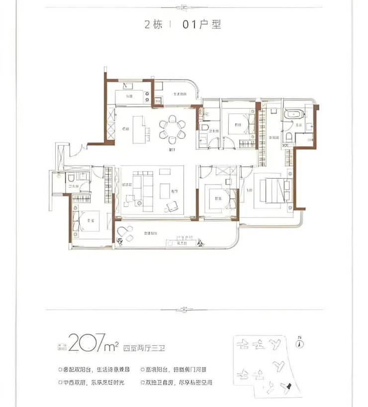 177-207㎡的大平层位于三期临江楼栋,客厅连接 7 米长的景观阳台,能看到蕉门河景色,适合追求居住品质的改善型买家。