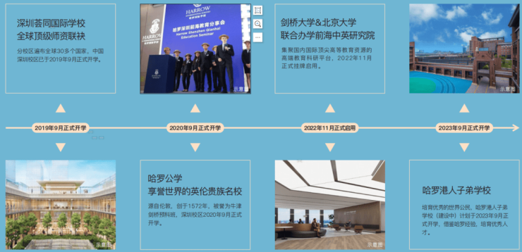 世界著名学校英国哈罗公学(已开学)、哈罗港人子弟学校(在建中)、美国荟同国际学校(已开学),以及剑桥大学&北京大学联合办学前海中英研究院(已开学)