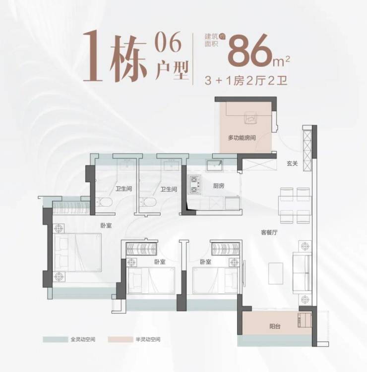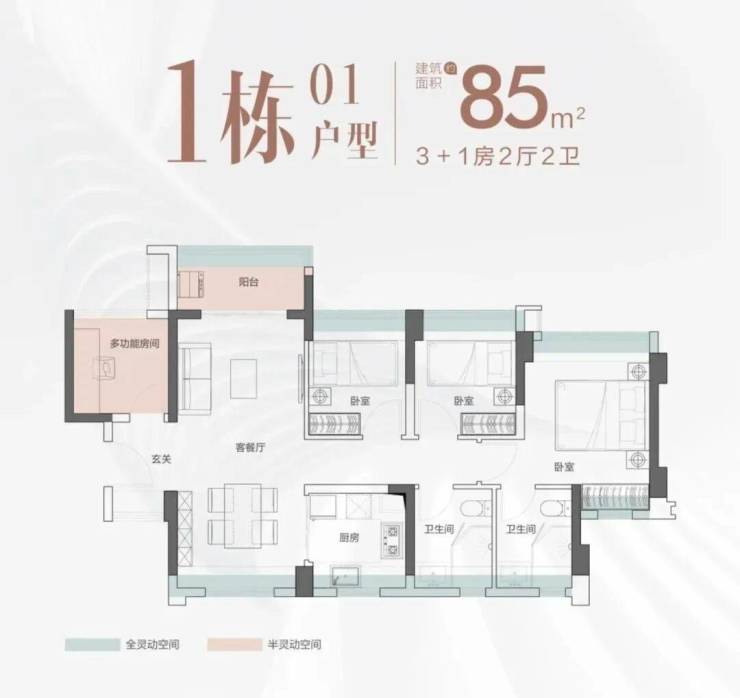 建面约83-85㎡四房:3+1房2厅2卫,南北通透,竖厅一体化设计,主卧套房配备独立卫浴,多功能空间可灵活改造。