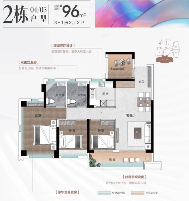 建面约96-97㎡四房:3+1房2厅2卫,阔绰竖厅设计,约6米宽景大阳台,三面采光主卧套房,适合多孩家庭或三代同堂。