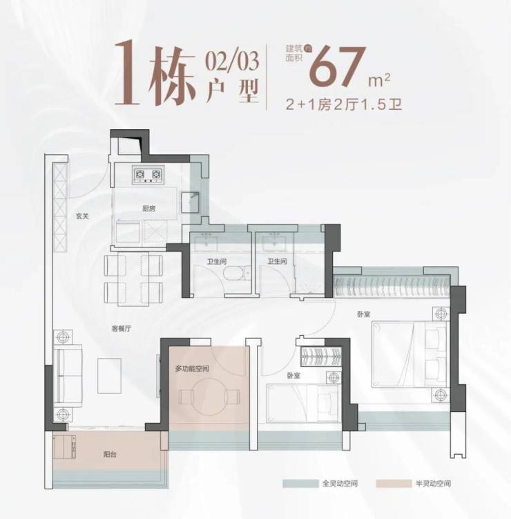 建面约67㎡三房:2+1房2厅1.5卫,四开间朝阳,采光优越,1.5卫设计提升使用效率,适合刚需家庭。
