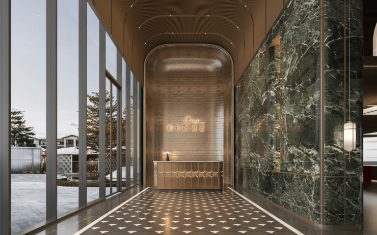 在方案设计阶段,设计团队采用现代轻奢风格,结合广州岭南在地元素,如镬耳屋、雕窗、石材拼花,同时结合骑楼建筑、建筑穹顶等元素,用现代的设计语言表达对广州中西合璧的历史记忆。