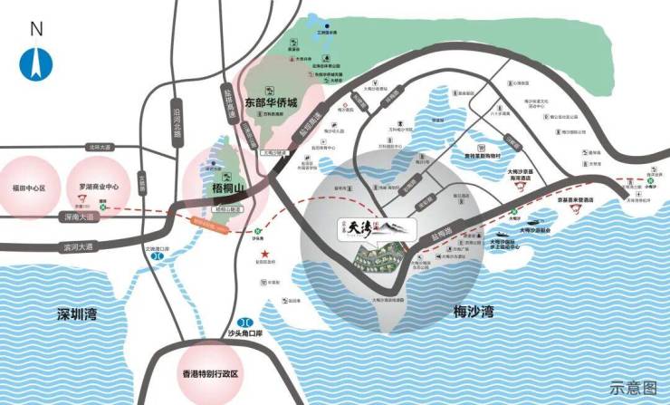 毗邻城市快速路、地铁8号线,约15分钟罗湖中心,约25分钟福田CBD,约60分钟畅达大前海自贸区,从东部的海开往西部的湾。沙头角、莲塘双口岸一站式深港通行。