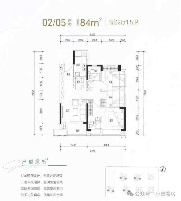 建面约84㎡是传统竖厅动静分区格局,客厅进深7.55米(不含阳台),开间3.4米,主卧8.4㎡(不含主卫和飘窗),空间确实会偏紧凑一点,但没什么硬伤,实用性还是非常不错的。