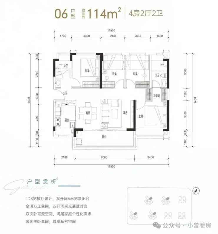 建面约114㎡是传统短进深大开间横厅格局,通透性很好,客厅进深6米,开间4.3米(不含阳台),配有6米宽景阳台,主卧套间设计,配衣帽间和三段式卫生间,这个户型很比较讨喜年轻的购房群体。