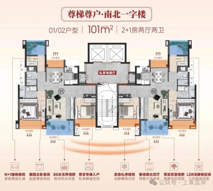 惊喜之一,此次推出的专梯入户101㎡2+1房产品,产品确实是小区当中最优。不仅位于项目楼王6栋,是项目内唯一一栋南北一字楼,还是小高层设计;
