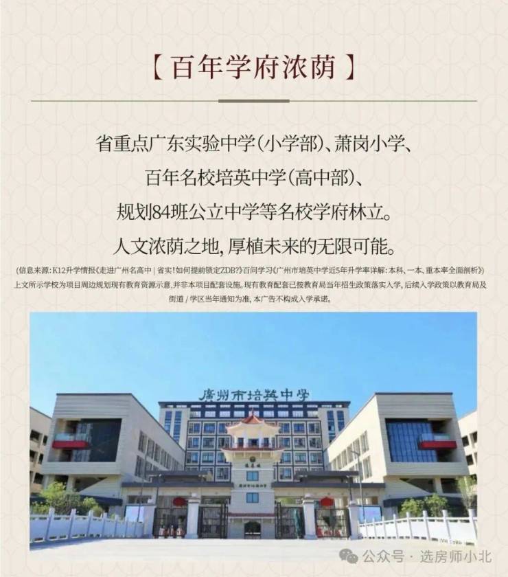 学校方面,虽然没有配建学校,但参照周边楼盘,(全地段摇号)有萧岗小学/与广东实验中学(小学部)、百年培英中学(高中部)为邻,培英中学高考升学率稳居90.3%,形成从启蒙到高中的全龄优质教育矩阵(具体学区以官方划分为准)