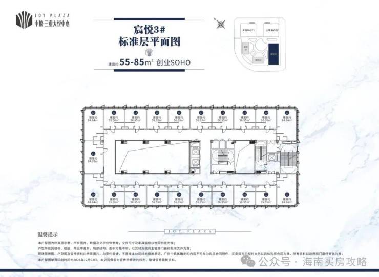 宸悦3#,创业SOHO,建筑面积(除底商)约7900㎡,总高7层,3梯21户,标准层高4.5米。